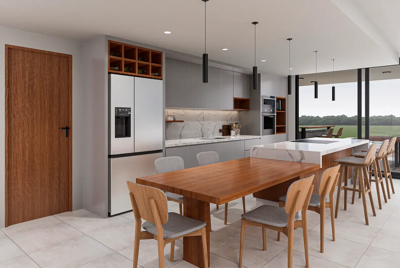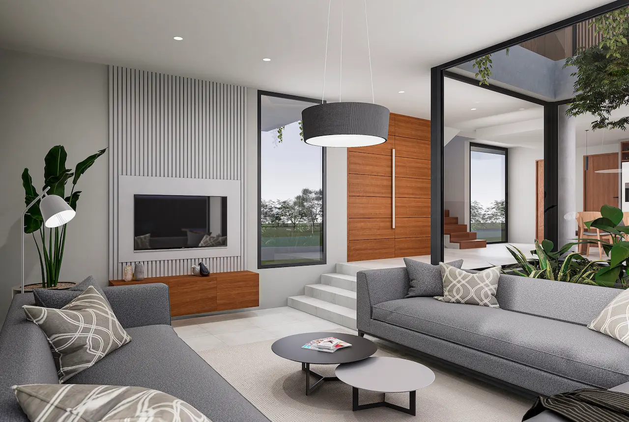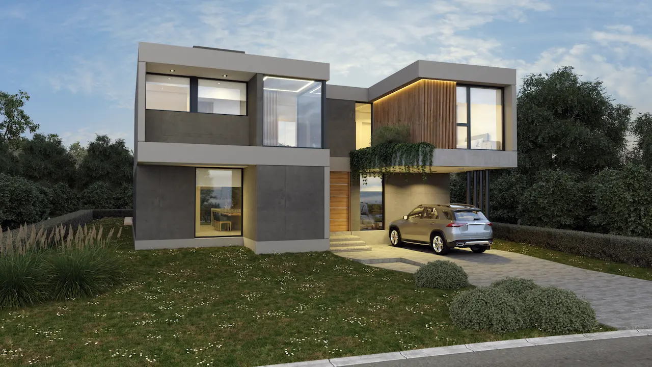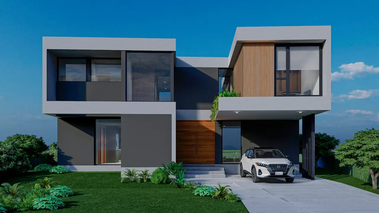 Vivienda de dos plantas ubicada en el barrio Santa Clara al Sur, San Vicente, implantada en una parcela irregular y diseñada para una joven familia. Con un enfoque vanguardista, la casa integra espacios amplios y funcionales de reunión, recreación y descanso. Destaca un living en desnivel semi enterrado que genera una sensación de refugio, conectado a través de un hall y patio verde con el área de cocina y galería semicubierta. Grandes ventanales se abren hacia el parque y enmarcan una pileta lineal. En planta alta, tres dormitorios distribuidos en dos alas aseguran privacidad y vistas, incluyendo una suite principal con terraza privada. La materialidad combina hormigón armado, PVC simil madera y revestimientos texturados, con sistemas de climatización por piso radiante y equipos inverter.