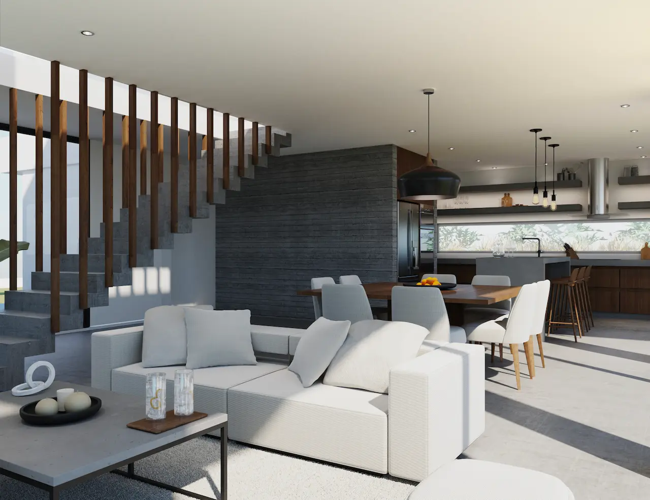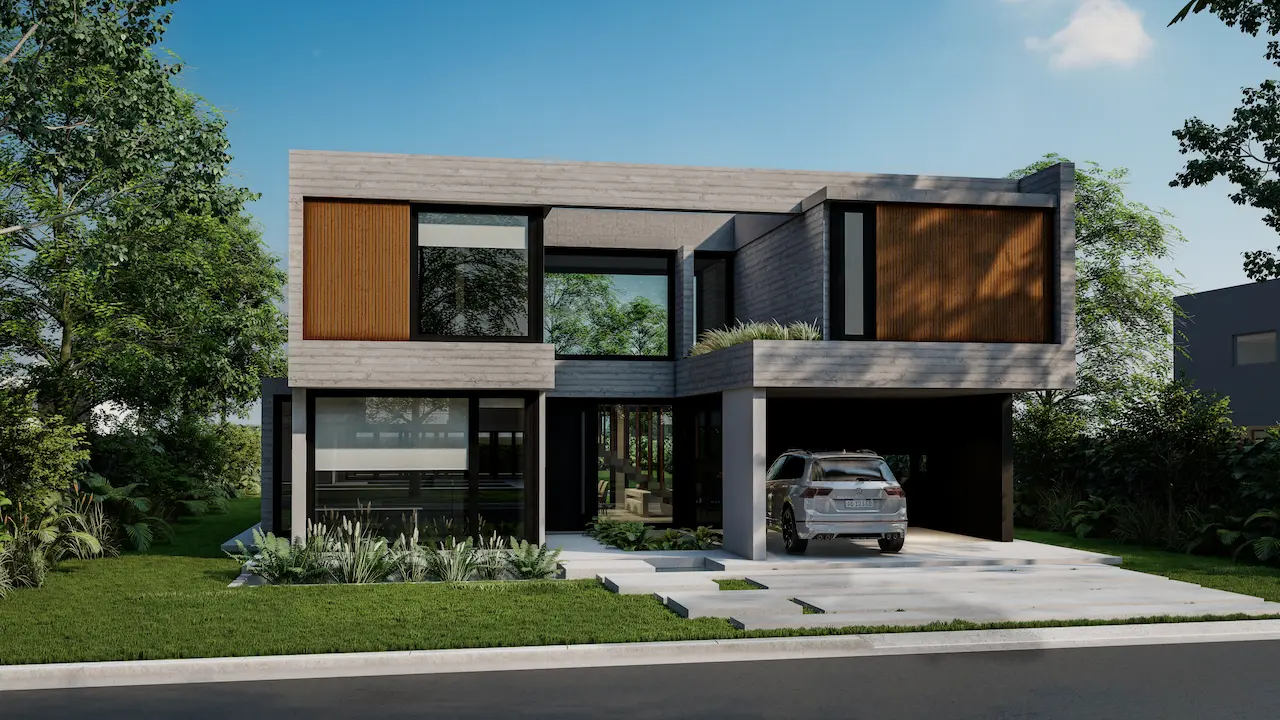 Vivienda de dos plantas ubicada en Greenville, Hudson, con un diseño racionalista y materiales de bajo mantenimiento. Pensada para una joven familia, integra espacios amplios para el trabajo, descanso y recreación, destacando un gran living-comedor con hogar a leña y vista al parque. En planta baja se articulan las áreas públicas, cocina, galería y un dormitorio multifunción, mientras que en planta alta se ubican tres dormitorios conectados a balcones y una terraza vegetal. Grandes ventanales, galería con techo de hormigón visto y pileta lineal integran el interior con el exterior. La casa combina hormigón visto, PVC símil madera y granito negro, con sistemas de climatización por piso radiante y equipos inverter.